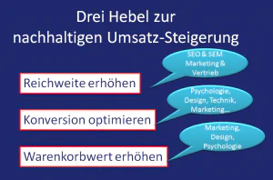 Die drei Hebel für Umsatzsteigerung in Online-Shops. Viele Disziplinen sind daran beteiligt. (Bild: interSales)