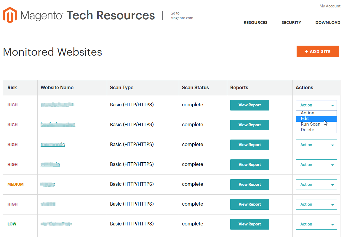11. Klicken Sie in der Übersichtsseite auf View Report, um sich die Ergebnisse des Scans anzusehen. Dort können Sie sich den Bericht auch als PDF-Datei herunterladen und sich historische Reports ansehen. Magento Backend security reports, Tech Resources Shopbetreiber können die Magento Sicherheit mit dem Security Scanner anhand detaillierter Berichte überwachen lassen. Diese werden täglich oder wöchentlich automatisch generiert.